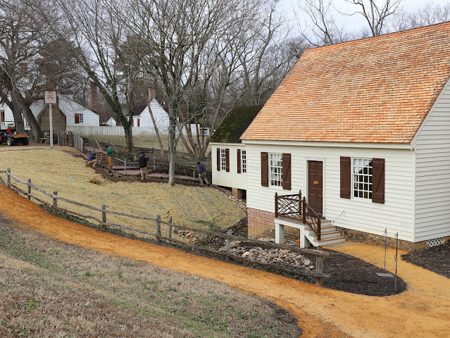 Well, as I noted before, January is the month for much needed repairs and restoration around Colonial Williamsburg. Here, for instance, crews are putting the finishing touches to some erosion control measures around the cabinetmaker's shop. From what I could see, the work included upgrades to drainage systems, paths, and lawn.